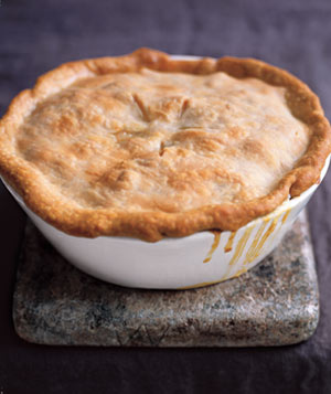 3.) Spread out pie crust on floured surface. Stir chicken into vegetable mixture, add salt and pepper to taste, and transfer to the baking dish. Place crust over top of filling, trim and flute edge. Cut a hole in the center of the pie crust.